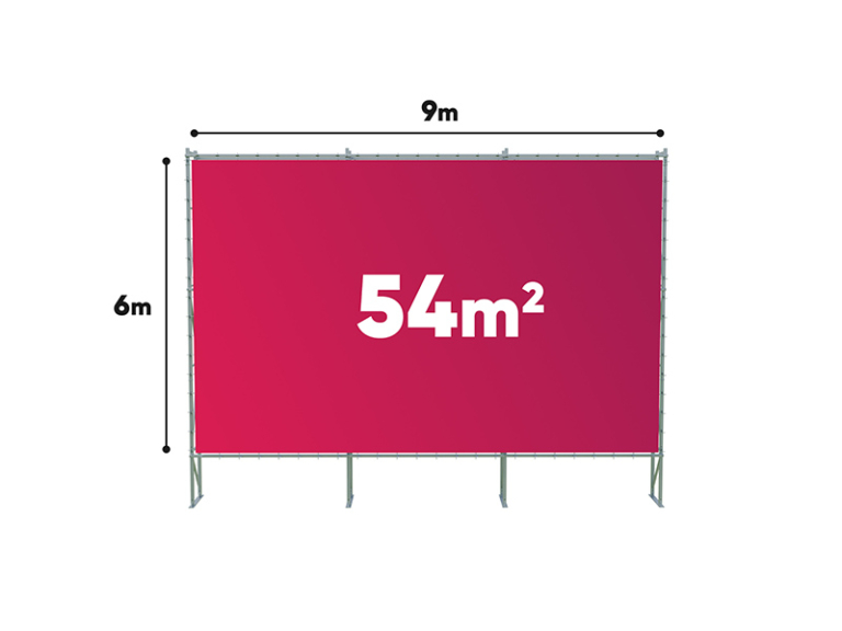 Prezentowana konstrukcja ma 9 m długości i 6 m wysokości, które są ustawiona na nodze o długości 120 cm, ale to Ty wybierasz, jaka będzie docelowa wysokość reklamowa baneru, a cena wynajmu pozostaje bez zmian! Standardowo wynosi ona 5,55 m, jednak możemy ją powiększyć aż do 6,75 m (wówczas całe nogi są zakryte reklamą) lub pomniejszyć np. do 5 m, co zmienia proporcje. Dzięki temu łatwo dopasujemy proporcje reklamy do Twojego projektu graficznego.